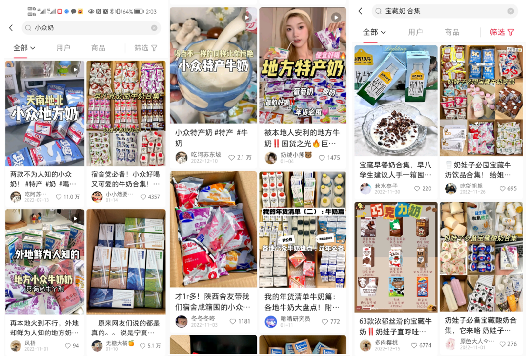 在小红书搜索#小众奶、#宝藏奶 合集等相关话题,可以看到来自全国各地的地域奶产品。输入羊奶、水牛奶的关键词,能检索出数十万篇种草笔记。