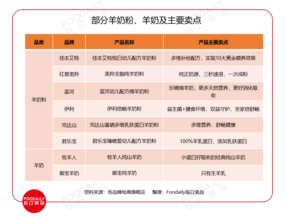 在汇总市面上主要的羊奶产品后,Foodaily发现:大部分产品均主打小分子蛋白好吸收、珍稀奶源等卖点;或以差异化原料配方作为核心竞争力。位居头部或排名靠前的品牌,大多具备奶源牧场、原料配方、生产技术及渠道方面的优势,具备一定的品牌知名度。