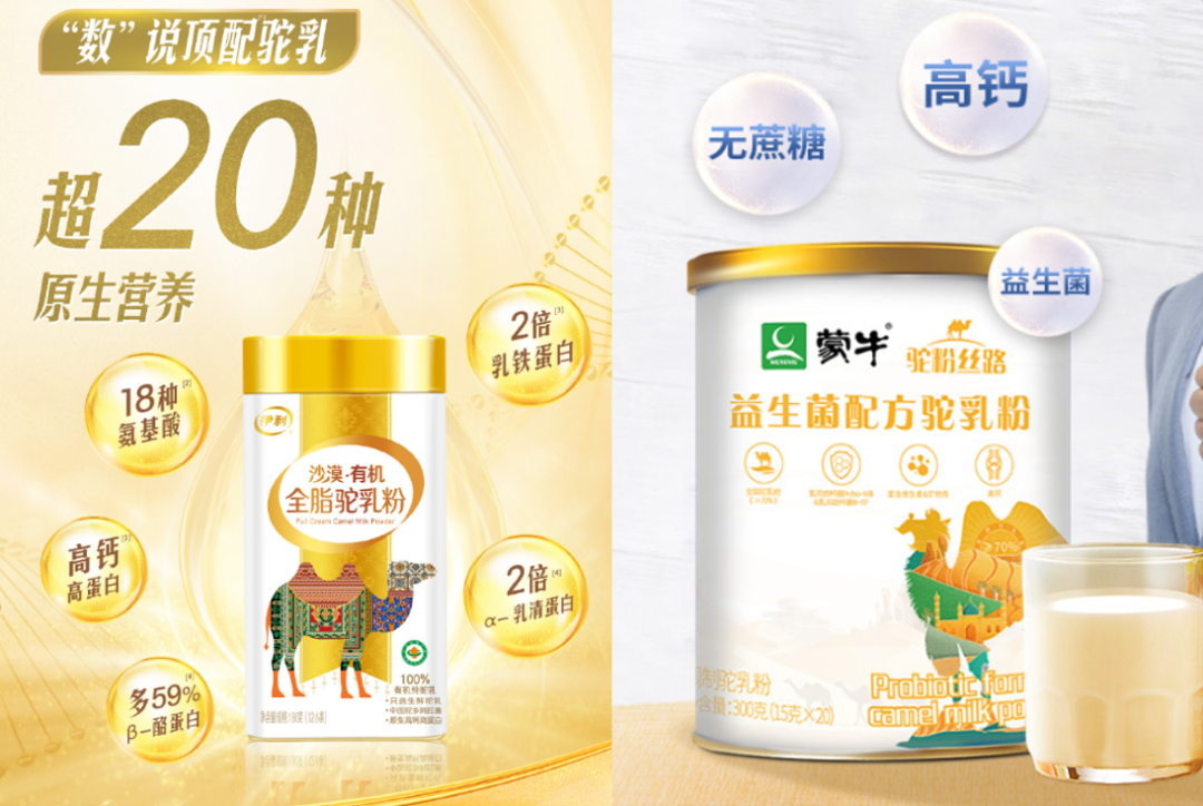 随着消费者对于小众奶越加认可、青睐,近几年,一批知名乳企陆续推出骆驼奶粉。去年10月,伊利推出宣称采用100%纯驼乳的沙漠有机全脂驼乳粉;此前,蒙牛推出添加了自主培育的M8母乳益生菌的益生菌配方驼乳粉。