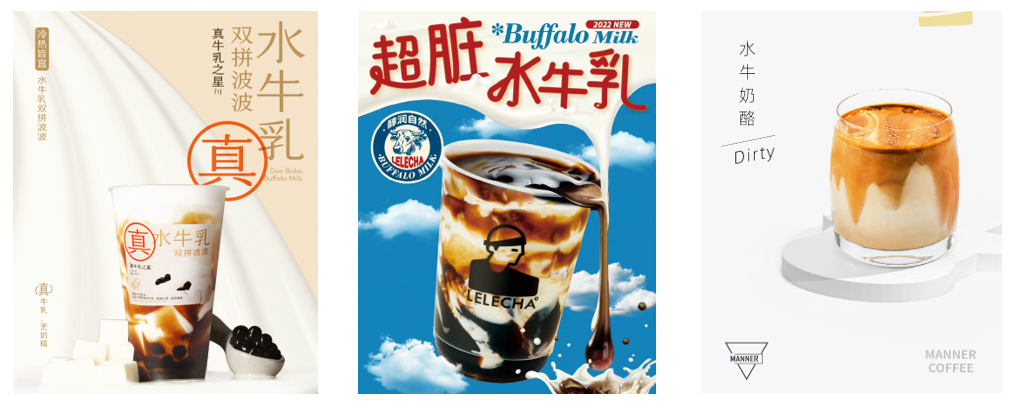 喜茶在2021年推出以水牛乳为原料的功夫红豆双皮奶后,又在今年3月推出水牛乳双拼波波;在2022年下半年,Manner咖啡推出水牛奶酪Dirty,乐乐茶推出水牛奶脏脏茶系列新品,分别将水牛奶与咖啡和茶相组合。有咖啡师表示,从甜味的角度,水牛奶更适合做Dirty,香甜顺滑好入口。
