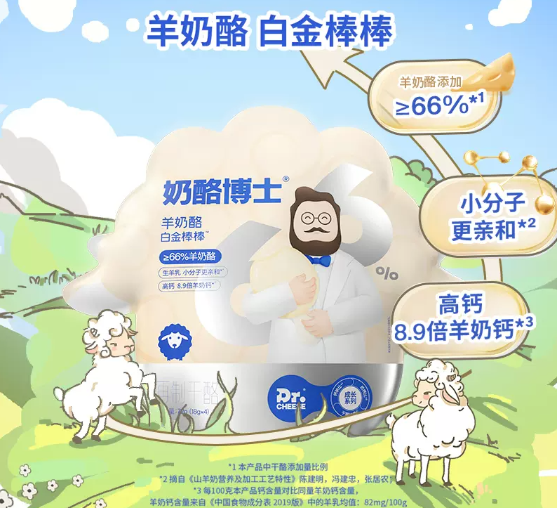 常年混战婴配奶粉的羊奶,或许能在聚焦儿童群体的奶酪棒赛道,形成“降维打击”。此前,奶酪博士就推出过一款羊奶酪白金奶酪棒,主打“添加≥66%的羊奶酪”、“小分子更亲和”、“8.9倍羊奶钙”等卖点,凭借差异化的营养特性为同质化较严重的奶酪棒注入了新鲜活力。