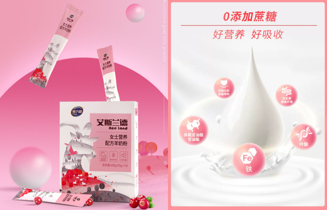 在去年年底,艾斯兰德推出一款从女性群体需求切入的女士营养配方羊奶粉。产品在益生菌+膳食纤维组合改善肠道健康的基础上,额外添加玫瑰花粉、蔓越莓粉,并强调高铁、维C等聚焦女性生理需求的营养成分。