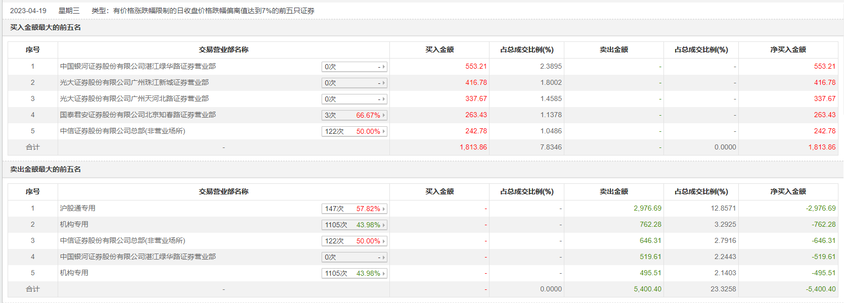 4月19日,冠豪高新今日跌停,龙虎榜数据显示,上榜营业部席位全天成交7214.26万元,占当日总成交金额比例为31.16%。其中,买入金额为1813.86万元,卖出金额为5400.4万元,合计净卖出3586.54万元。具体来看,机构合计净卖出1257.8万元。此外,沪股通专用、中信证券总部(非营业场所)分别卖出2976.69万元、646.31万元;中国银河证券湛江绿华路证券营业部、光大证券广州珠江新城证券营业部分别买入553.21万元、416.78万元。