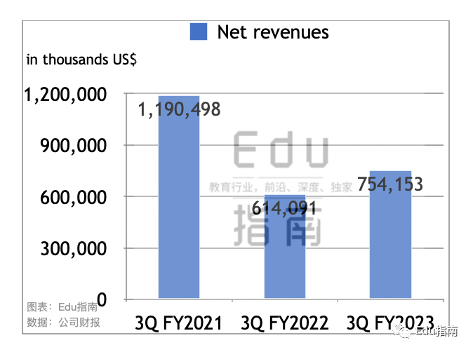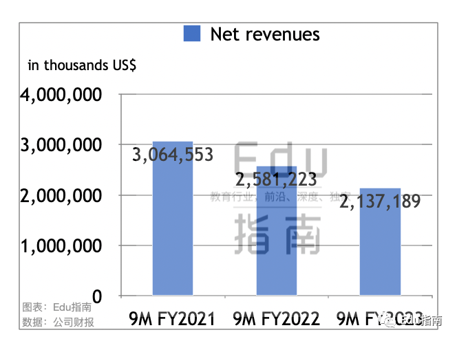 2023财年前三个季度新东方公司营收为21.4亿美元,同比上一财年同期的25.8亿美元,营收下降17%。该公司2022财年前三季度营收同比2021财年同期的30.6亿美元,表现为下降16%。即新东方前三季度营收降幅稍高于上一财年。