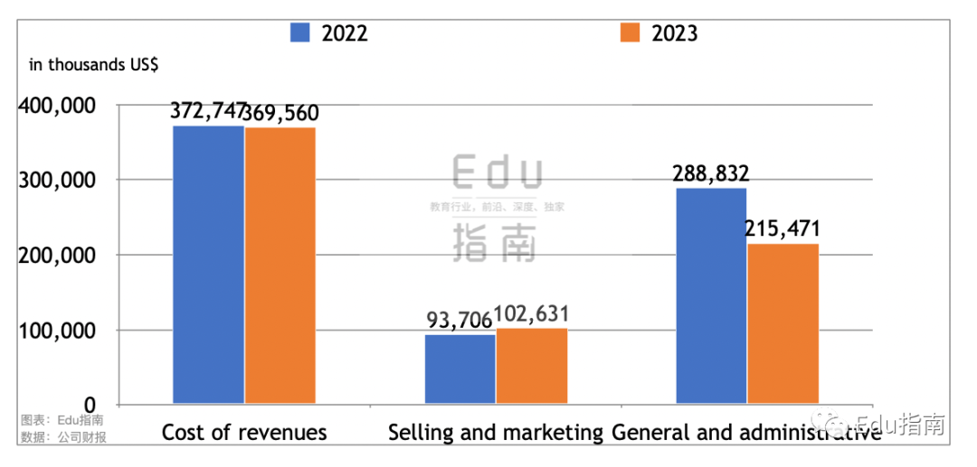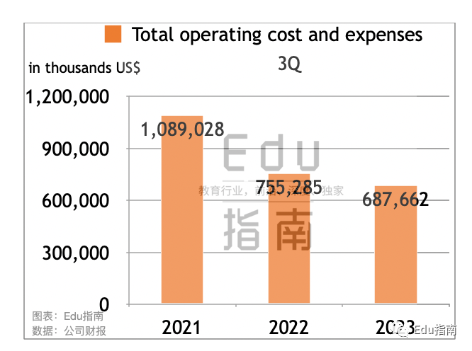 新东方公司2023财年第三季度运营成本和费用额为6.9亿美元,同比2022财年同期的7.6亿美元,该项减少9%。本财年运营成本与费用额相较2021财年同期下降37%。根据财报,总成本费用减少原因是该公司2022财年裁员导致设施和员工减少。
