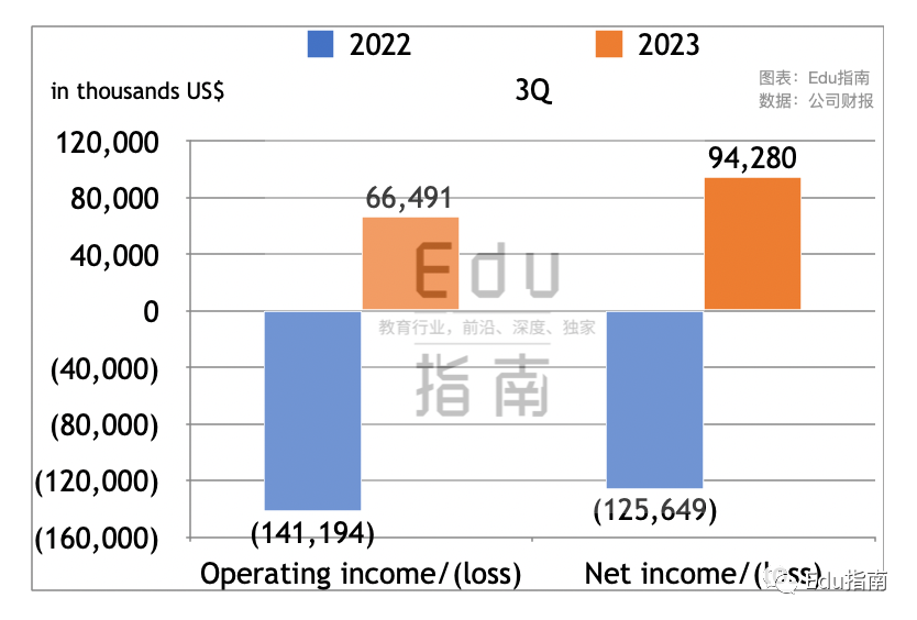 根据财报,新东方2023财年第三季度经营利润为6649万美元,上一财年同期为经营亏损1.4亿美元。本财年该项扭亏为盈。
