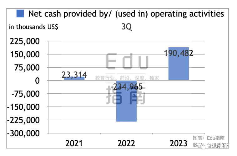 新东方Q3经营活动现金净流入额为1.9亿美元,上一财年为净流出2.3亿美元,2021财年Q3为净流入2331万美元。本财年该项从上一财年的流出转为流入,且净流入额高于2021财年Q3时期表现。