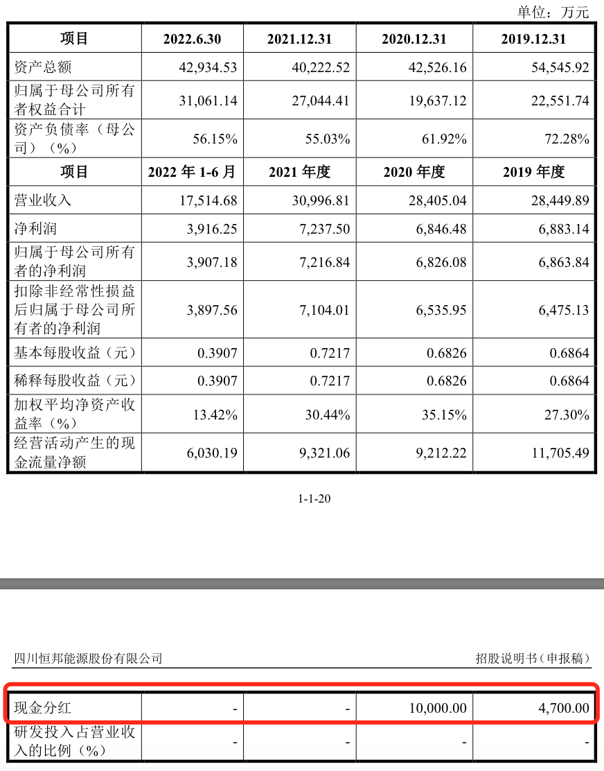 不过耐人寻味的是,在2019年恒邦能源曾分红4700万元,2020年分红1个亿,这之后的2021年恒邦能源获得受理进行了预披露,而公司2019年+2020年的净利润合计也才1.37亿元。IPO前完成大额分红,却巴巴望着募资来充盈还款,恒邦能源也因此受到市场诸多质疑。