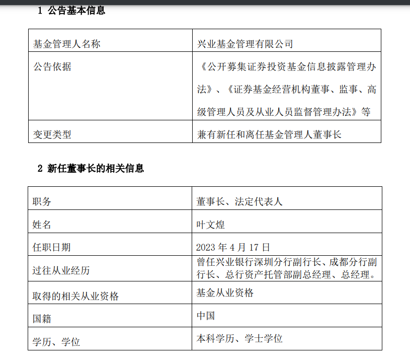 4月19日,兴业基金发布高级管理人员变更公告称,公司董事长官恒秋因年龄原因离任,由叶文煌接任公司董事长,任职日期为4月17日。