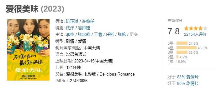 在影版《爱很美味》的豆瓣页面上,很多网友都在踊跃发表对这部作品的肯定。剧版粉丝满足、影评人认可、影迷夸奖,按照一部普通商业电影的评判标准,《爱很美味》至少是一部好电影。