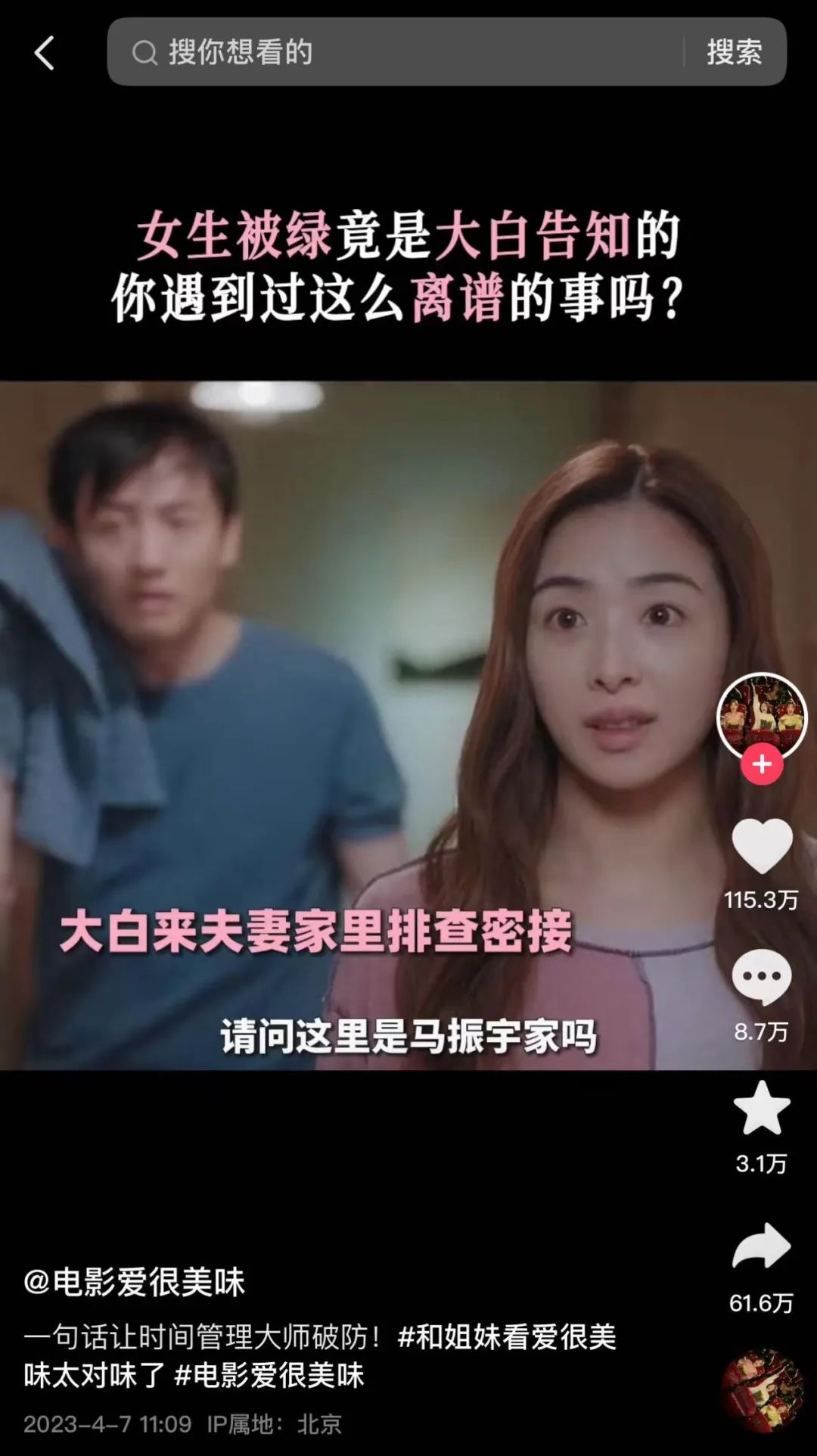 目前官抖上唯一点赞过百万的物料是片中女主被大白排查密接得知男友出轨的剧情片段。相对而言,这类容易引发话题讨论的社会向热点,特别是有原型新闻的内容本就是很容易造成传播的。除此之外,影片所聚焦的女性现实议题,也有很多内容可以取材发酵,鼓动网友参与讨论。
