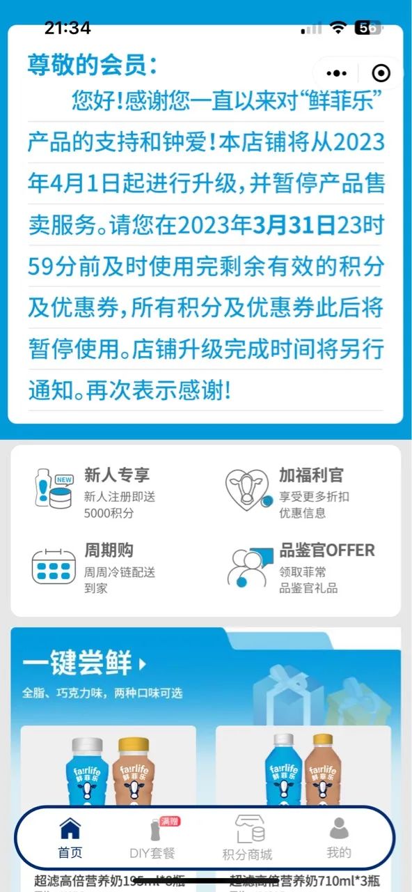 今天(4月19日),小食代在“鲜菲乐”(fairlife)官方微信小程序、京东旗舰店看到,该品牌在上月底挂出了暂停产品售卖服务通知,其告知消费者店铺将从2023年4月1日起进行升级。“店铺升级完成时间将另行通知。”公告称。至于其天猫旗舰店,则已经已经无法搜到踪影。