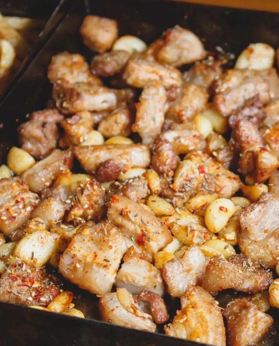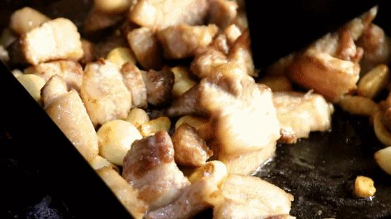 肥瘦相间的肉块水煮后撇去了油腻,搭配整粒的大蒜瓣,外皮焦脆,咬一口肉汁爆开,香而不腻。