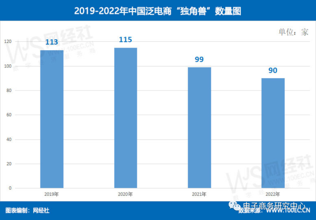 《报告》显示,2022年中国泛电商“独角兽”数量90家,同比2021年99家下降9.09%,此外,2019年113家、2020年115家。