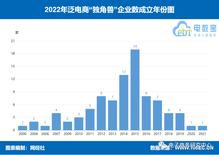 2022年我国泛电商“独角兽”企业多为5-10岁,成立时间主要集中在2011至2017年共86家,占比达74.4%,其中2015成立数最多,达19家。