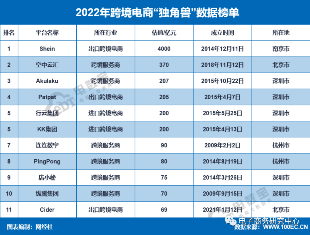四、跨境电商“独角兽”11家,总估值5566亿元