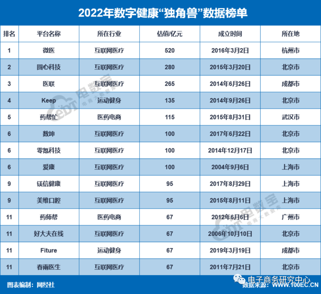 七、数字健康“独角兽”14家,总估值2073亿元