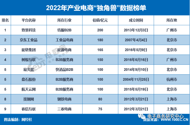 三、产业电商“独角兽”9家,总估值1150亿元