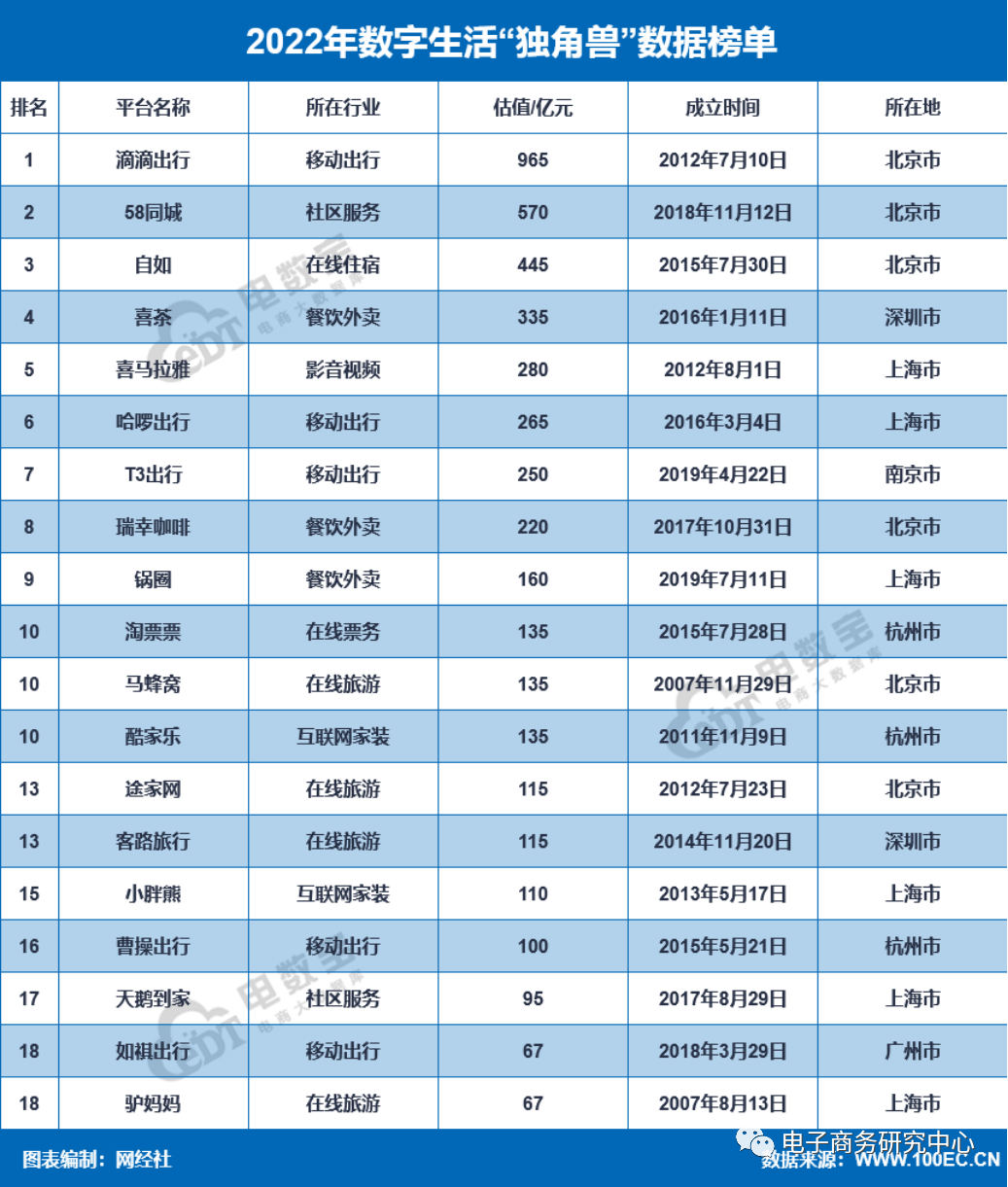 数字生活“独角兽”19家,总估值4564亿元,占比9.44%;据估值排名依次为:滴滴出行、58同城、自如、喜茶、喜马拉雅、哈啰出行、T3出行、瑞幸咖啡、淘票票、马蜂窝、酷家乐、途家网、客路旅行、小胖熊、曹操出行、天鹅到家、如祺出行、驴妈妈。