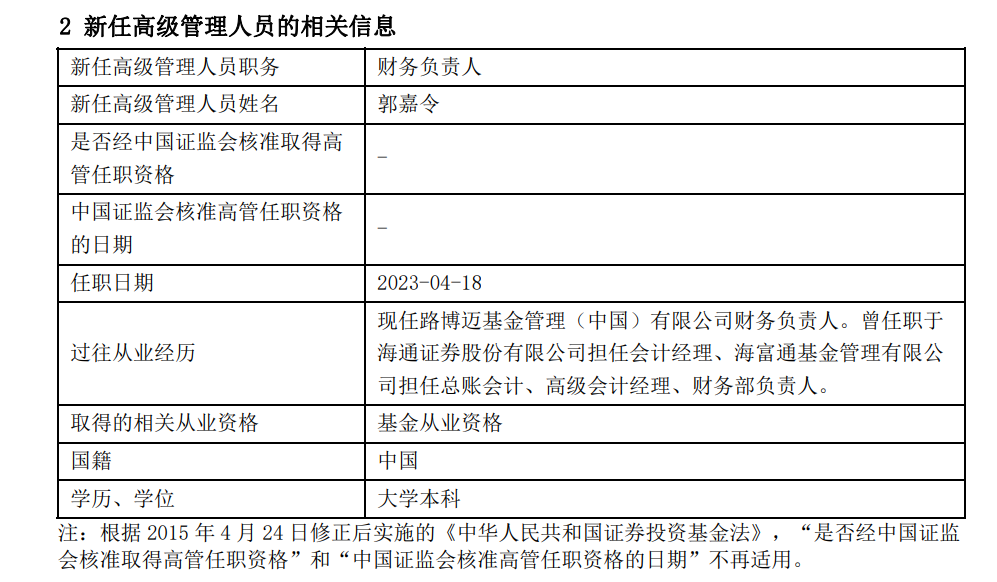 日前,路博迈基金公告了新任财务负责人的信息,公告显示,郭嘉令此前曾担任海富通基金财务部负责人。