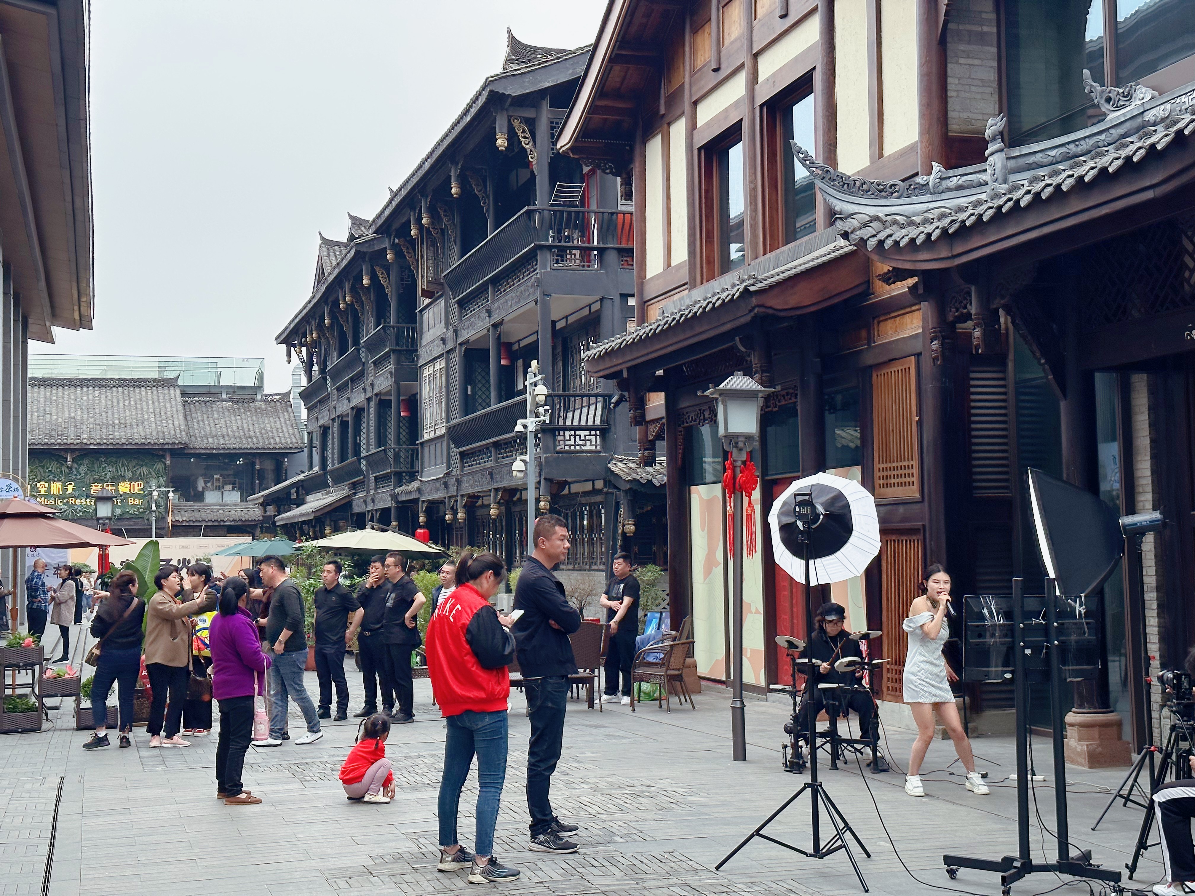 文殊坊二期的街巷上还有不少年轻人做直播,短短一条巷子中,就有4-5个直播团队,多为歌舞表演。互联网新兴事物让古香古色的街区焕发出年轻活力的一面。