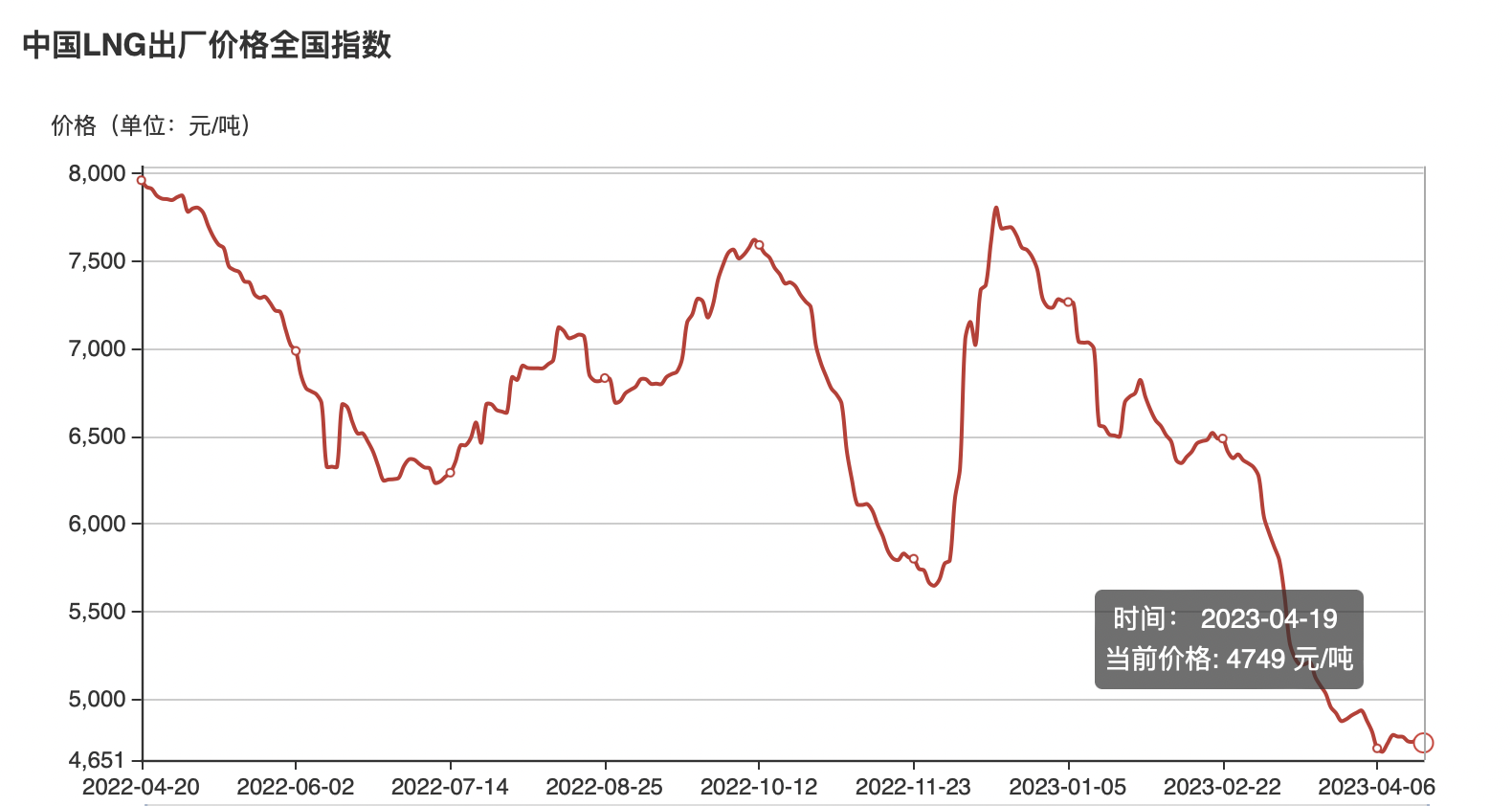 上海石油天然气交易中心数据显示,4月19日,国内LNG出厂价格为4749元,同比下降40%。期内,山东地区的LNG价格居全国第一高位,为6500元/吨;内蒙古、陕西、山西等主产地区的价格在4200元/吨左右。
