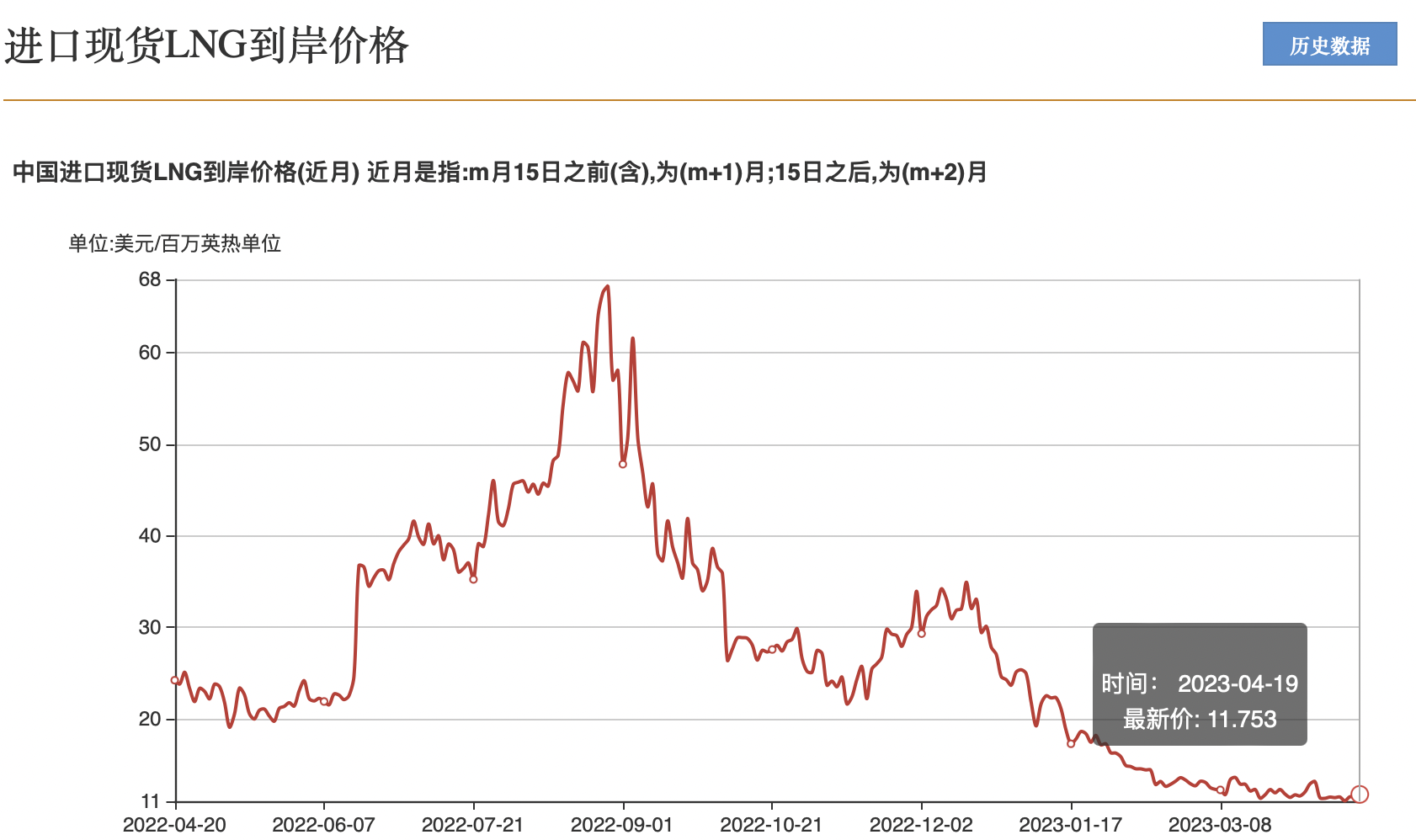 上海石油天然气交易中心和隆众资讯数据均显示,4月19日,东北亚LNG现货均价约为12美元/百万英热单位(约合人民币3836元/吨),同比下降超51%。