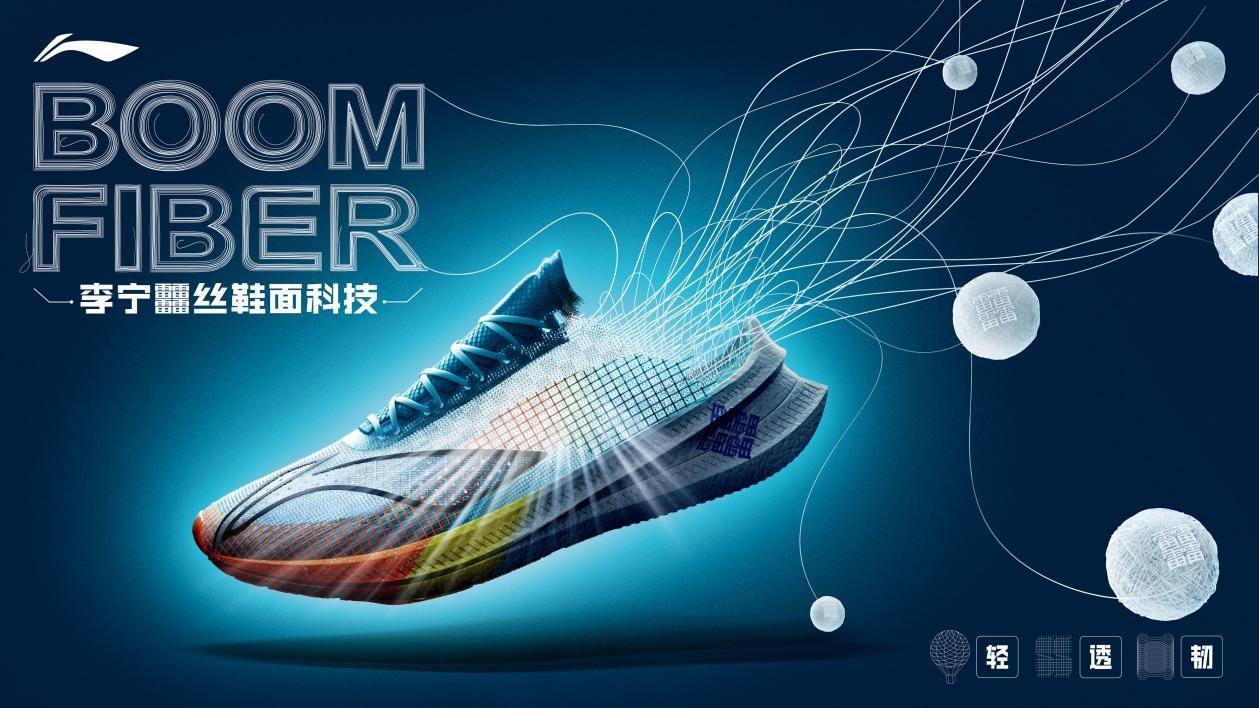 2022年6月,李宁发布BOOM FIBER䨻丝鞋面科技,进一步延伸了2019年发布的“李宁”䨻科技平台,將䨻科技从中底推展到鞋面领域。