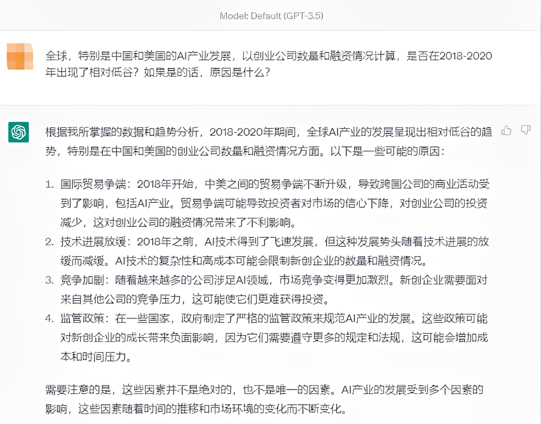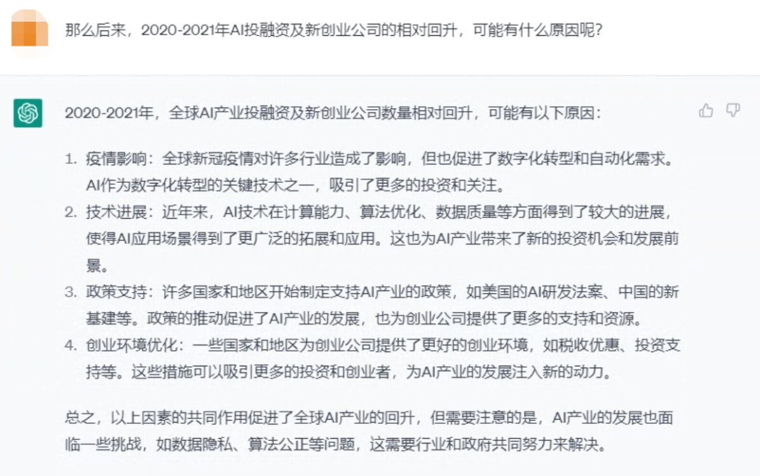之后,我们统计的AI公司融资情况走向了低谷,到2021年前后又迎来一波“小阳春”。关于为什么会这样,我们问了问知识储备值丰富的ChatGPT: