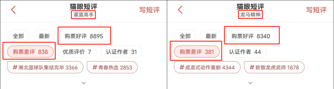 而从购票平台来看,口碑反噬效应表现得更为直接:截止4月20日晚上10点,在猫眼电影电影页面评论区里,购票好评近8800+,购票差评达到830+,差评率达到8.6%,这在猫眼上已经是非常高的数字。作为对比,豆瓣评分仅6.1的《龙马精神》,其购票好评8300+,差评380+,差评率不过4.3%。