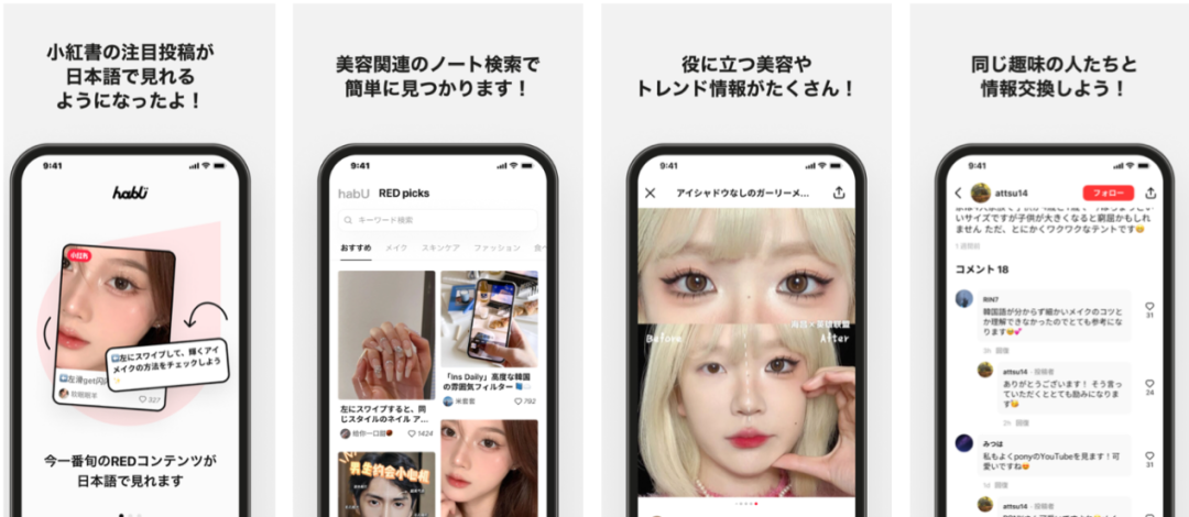 它由“habU 和小红书”两部分组成,前者主要为用户在 habU 平台上发布的彩妆、护肤、美甲、发型等内容,后者主要为小红书主站上的热门内容,系统会将热门动态自动翻译为日文。