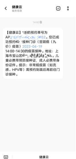5、收到健康云平台发送的疫苗到货短信,请及时登录健康云进行下一步门诊接种时间预约,如不进行此操作,逾期后需要重新排队登记。