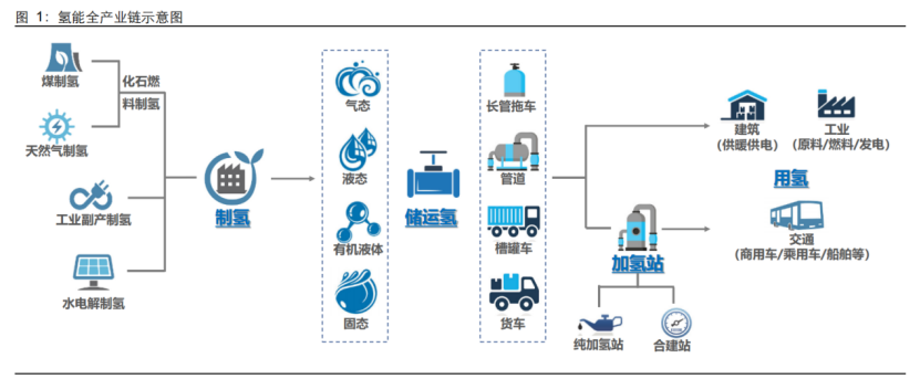 下游是应用领域,通过加氢站,将氢加注到商用车/乘用车/船舶等。