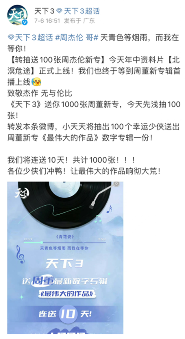 去年7月,《天下3》在新资料片上线之际,借用周杰伦新专辑进行转发抽奖活动。