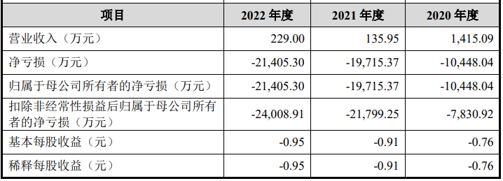 招股书显示,公司是即将进入商业化阶段、专注于儿科疾病、呼吸系统和肺部疾病领域全球化创新药研发的生物医药公司。2020年、2021年、2022年,公司实现营业收入分别为1415.09万元、135.95万元、229万元,同期实现归属于母公司所有者的净亏损分别为1.04亿元、1.97亿元、2.14亿元。报告期内,公司营业收入为其他业务收入,无主营业务收入。其他业务收入主要来源于技术转让和提供针对技术授权许可的技术服务收入。