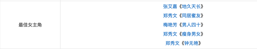2001年,郑秀文凭借《孤男寡女》第一次获得第20届香港电影金像奖最佳女主角提名,与她争夺这一奖项的还有张曼玉、章子怡、杨紫琼和秦海璐。