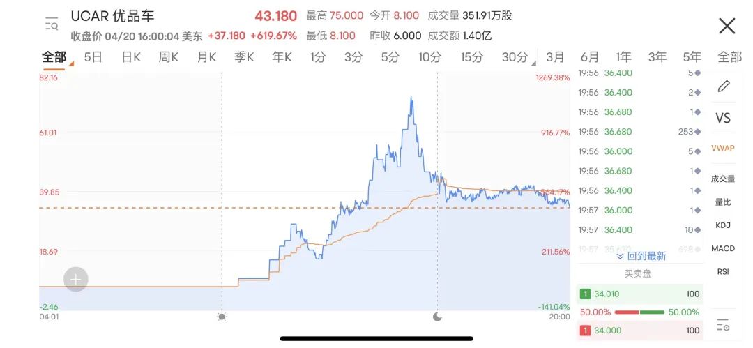今日,优品车登陆纳斯达克,成为中概新能源换电第一股。上市首日,优品车股价一度升至75美元,较优品车6美元的发行价上涨了1150%,之后回落至43.18美元,优品车最终收盘价较发行价上涨619.7%,市值达22.67亿美元。