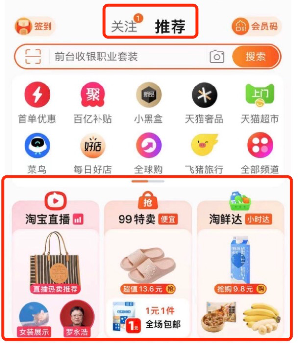 距离上一轮改版刚刚过去不久,此前,淘宝才刚刚将99特卖频道搬上了首页。在最新改版的手机淘宝首页,淘宝直播、99特卖、淘鲜达被摆在了显眼的C位,原先和“推荐”并行的“订阅”也改成了“关注”。