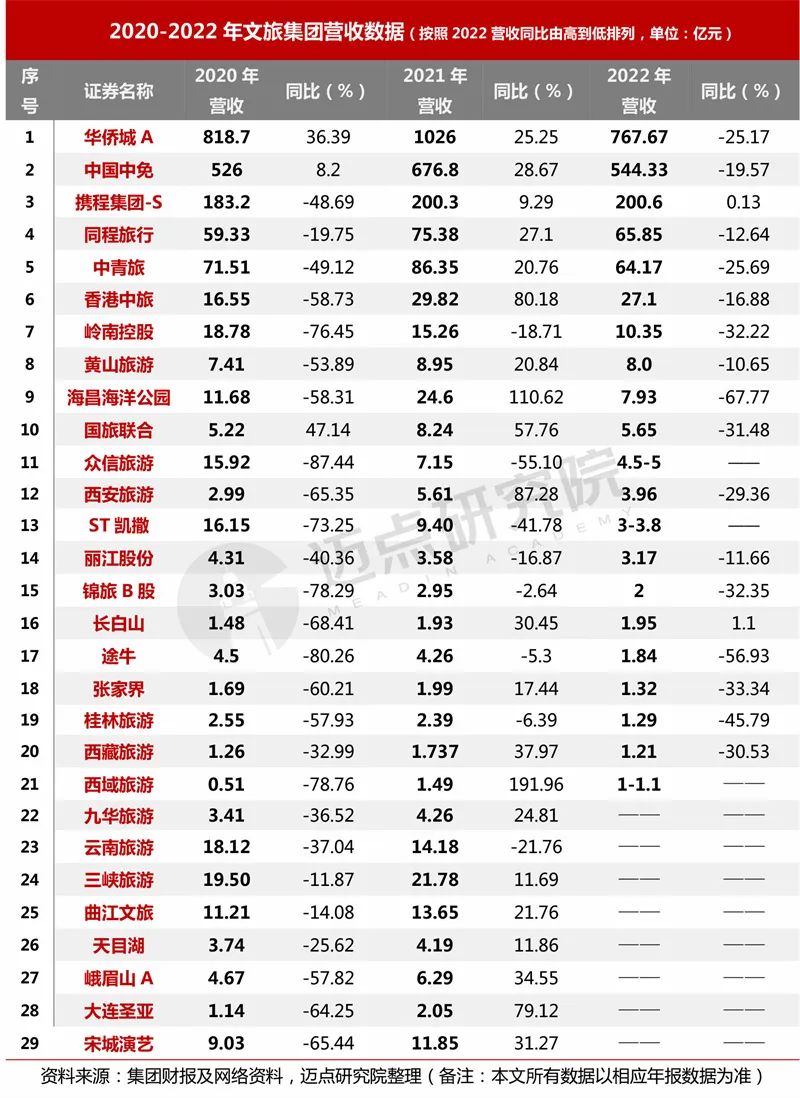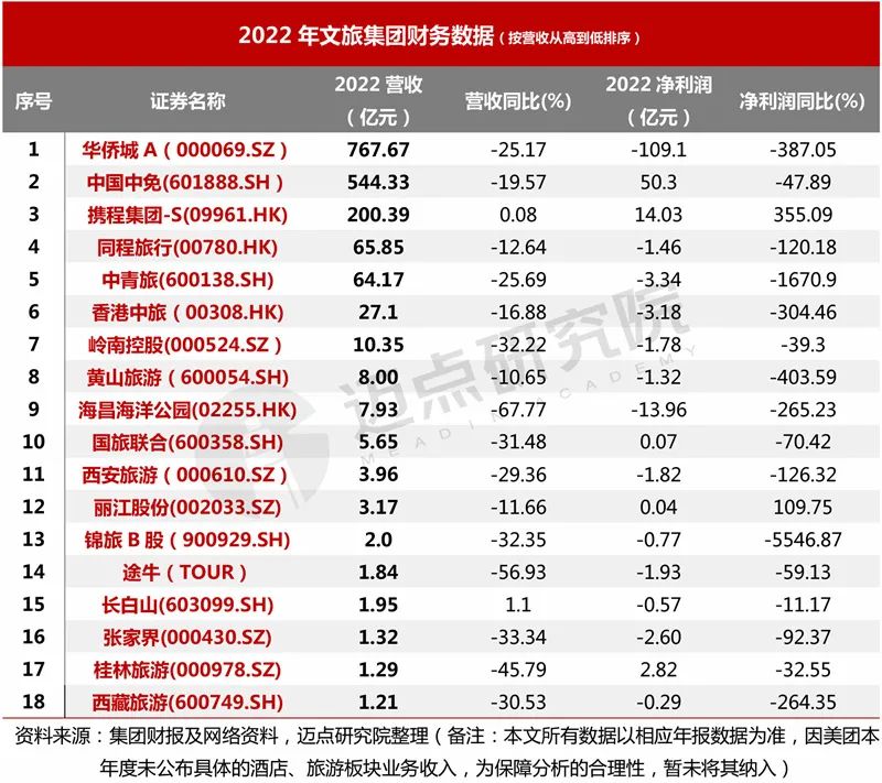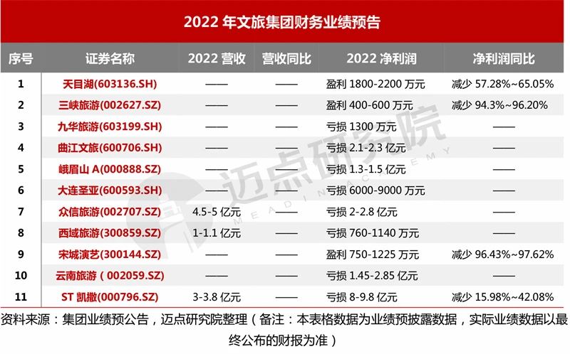 根据迈点研究院监测和不完全统计,包括美股、港股、主板各类文旅上市公司55家,本文选取其中以旅行社、景区乐园、综合类等以文旅为核心业务的代表性29家企业为样本进行分析,其中18家已发布2022年度财务数据,11家发布了业绩预告数据。