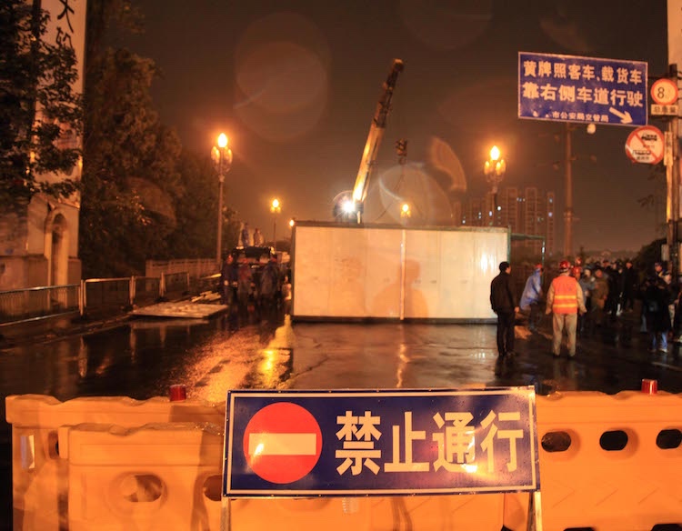 市民在南京长江大桥南引桥入口处围观最后一辆从桥南驶往桥北的汽车。