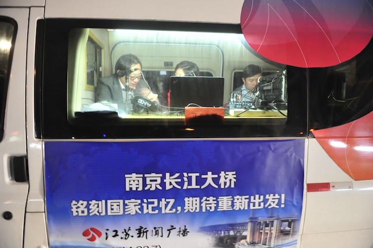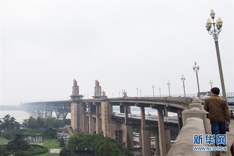 10月28日,蒙蒙细雨中不少市民前来到南京长江大桥上和大桥暂时告别。江苏新闻广播在大桥上做直播报道。