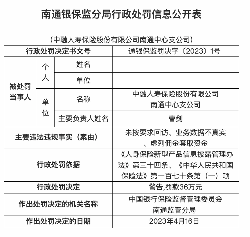 4月21日,南通银保监分局行政处罚信息公开表显示,中融人寿保险股份有限公司南通中心支公司因未按要求回访、业务数据不真实、虚列佣金套取资金,受到警告处罚,并处罚款36万元。