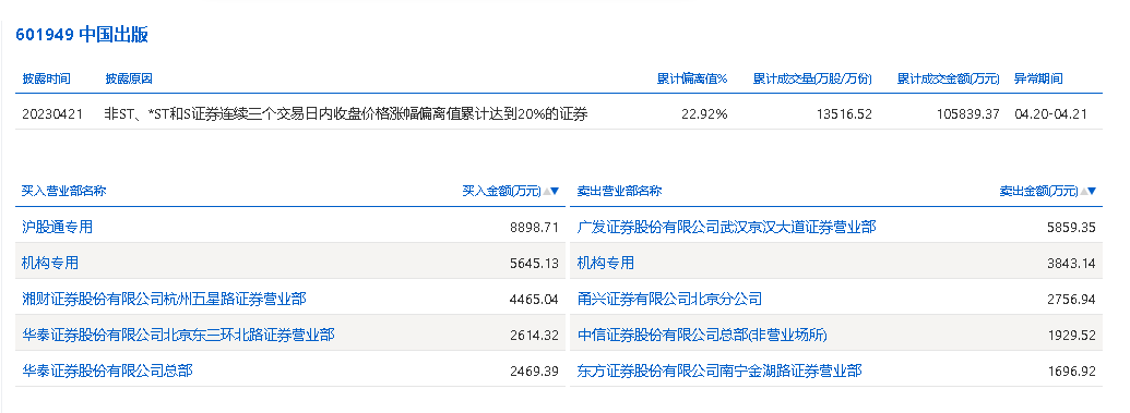 4月21日,中国出版今日涨停,龙虎榜数据显示,4月20日至4月21日期间,上榜营业部席位合计成交4.02亿元,其中买入金额为2.41亿元,卖出金额为1.61亿元,合计净买入8006.73万元。