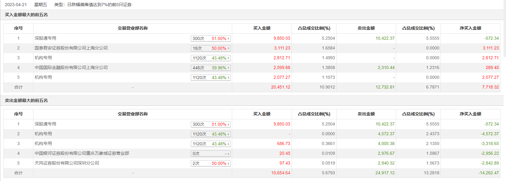 4月21日,太极股份今日跌停,龙虎榜数据显示,上榜营业部席位全天成交4.85亿元,占当日总成交金额比例为25.84%。其中,买入金额为2.13亿元,卖出金额为2.72亿元,合计净卖出5971.82万元。