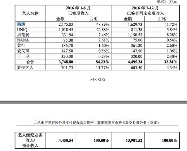 2010年,乐华文化签约了从韩回国的韩庚,前者成为其演艺事务的全球独家运作公司。之后,从演艺经纪到影视业务,乐华均与韩庚进行了深度合作,据悉,乐华文化享有韩庚参演《致青春》的4.25%的发行净收益,享有韩庚主演的《前任攻略》10%的发行净收益。可以说,韩庚是乐华文化旗下最大的一棵“摇钱树”。2016年1—6月,韩庚已实现收入2175.83万元,占公司艺人业务总收入的49%;7—12月,已签合同未实现收入的金额为1629.73万元,合计3805万元。同时,而韩庚还持有乐华文化2.47%的股份。