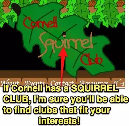 在这一千多社团中, 甚至还有个松鼠俱乐部:校内校外观察松鼠,观看与松鼠有关的电影,邀请专家来学校讲话,还会制作并贩卖松鼠形状的饼干。如果康奈尔连松鼠社都能有的话,那你肯定能找到一个符合你自己独特兴趣的社团。