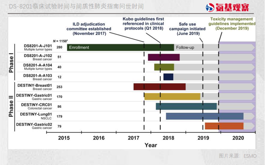 这不难理解,DS-8201刚刚进入临床试验阶段,ADC药物造成间质性肺炎的案例并不多,在T-DM1药物的使用中,间质性肺炎的发生率不过0.5%。所以,早期第一三共/阿斯利康并未提前预知,对间质性肺炎做出应对。