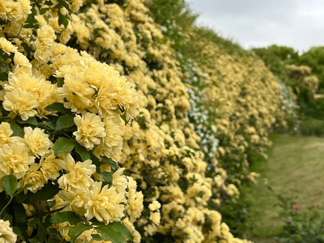 顺着芳香来到三号门悦林湖畔的月季主题花园,大片大片的木香花爬满了两人多高的回廊,远远望去好似一片花海瀑布。