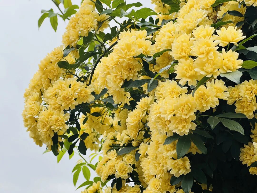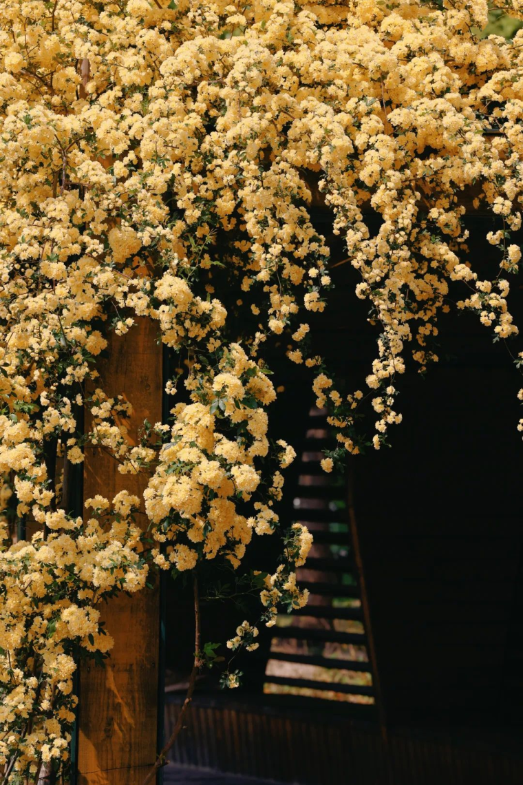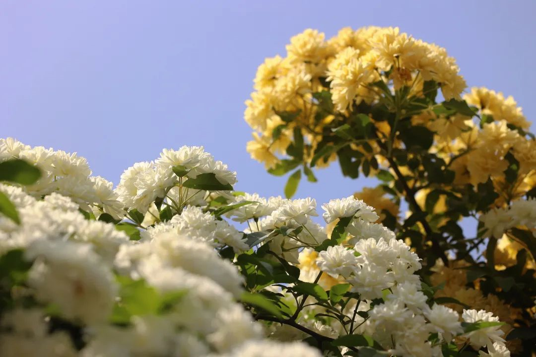 黄色的如砌金,白色的如堆雪。两种颜色的木香花从树梢一直蔓延,互相衬托,伸展着、相拥着,构成春天里一道靓丽的风景线。