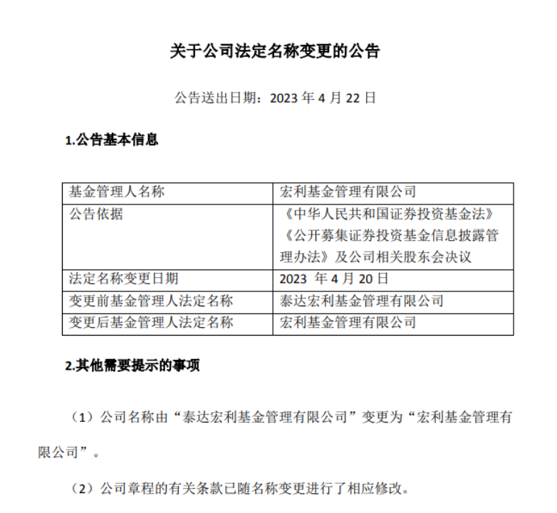 4月21日,泰达宏利基金发布公告,公司法定名称已于4月20日变更为宏利基金管理有限公司(以下简称宏利基金)。